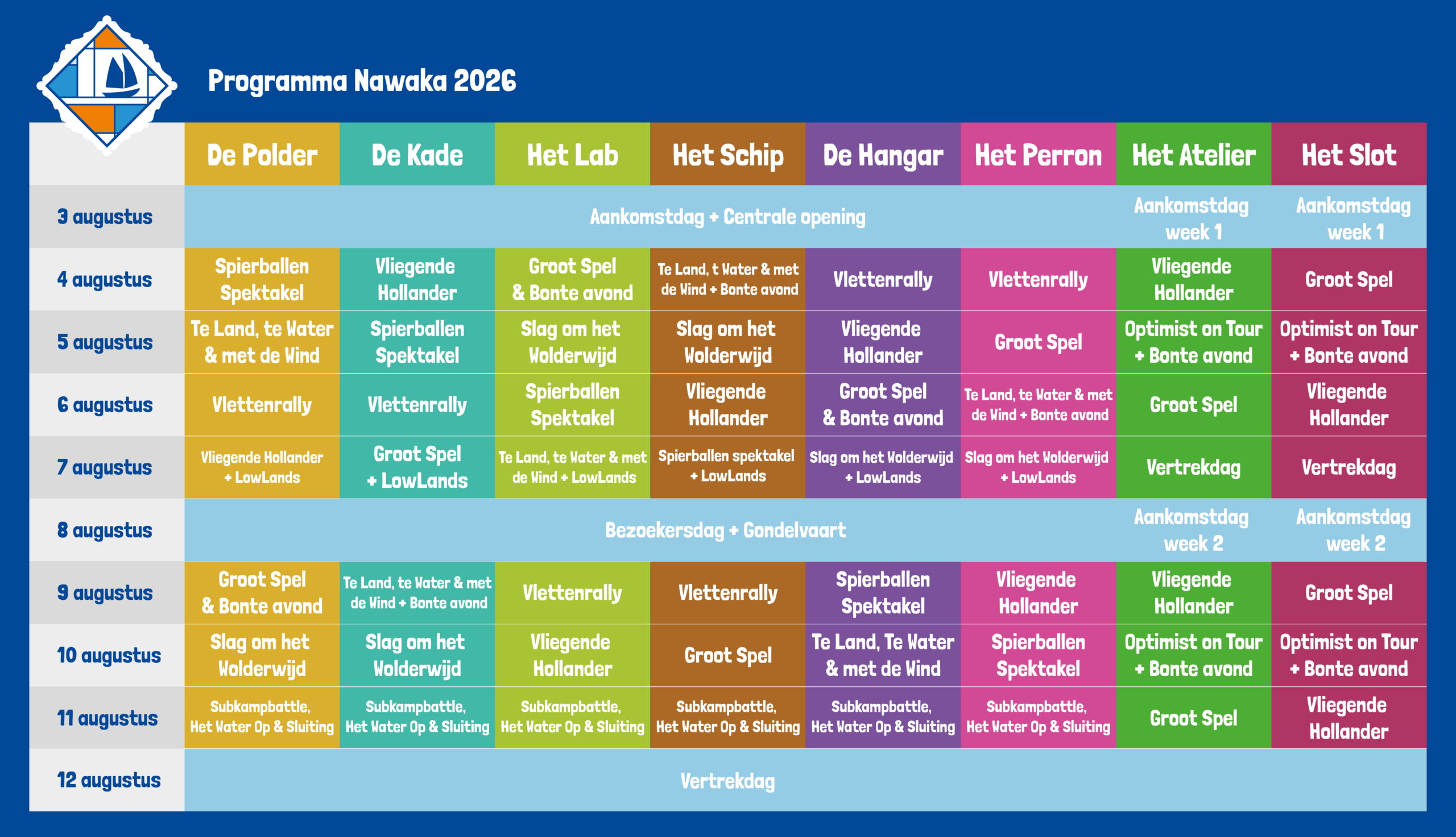 Aan het einde van Nawaka komt iedereen nog één keer samen voor de sail-out: de laatste keer dat we met z’n allen het water op gaan. De sail-out is niet zomaar een vaarmoment, het is een groots evenement waar iedereen naar uitkijkt. Wat er precies gaat gebeuren houden we nog even geheim, maar één ding is zeker: het wordt iets wat je niet wilt missen.
